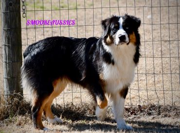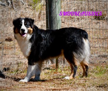 AKC/ASCA BLACK TRI MALE with white collar and blaze, copper points, and two beautiful blue eyes. He is a striking young male.